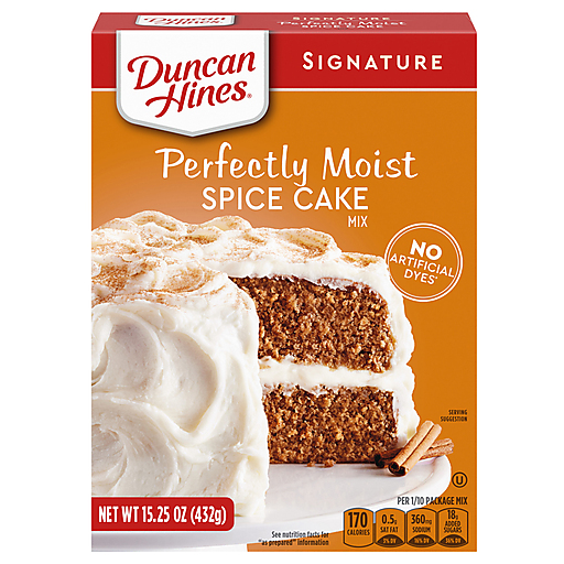 Duncan Hines Signature Perfectly Moist Spice Cake Mix makes a moist and delicious spice cake that is sure to become a family favorite. Made with cinnamon, nutmeg and allspice, the smooth and velvety cake batter makes it easy to bake a perfectly moist cake every time. Simply add water, eggs and vegetable oil to the baking mix and stir to combine. Pour into a pan and bake for the recommended time in the instructions. Prepare this spice cake mix to make coffee cake, a spice cake with cookies and caramel drizzle, a decadent layer cake with cream cheese frosting or add sprinkles for a festive birthday cake. You can also use it as a cupcake mix, or to make fun cake creations like cake pops. This certified Kosher boxed cake mix makes two 8 or 9 inch round cakes, one 13 x 9 inch sheet cake or 24 cupcakes. From birthday cake to single serve desserts, Duncan Hines has you covered when you're ready to bake and create. Bake someone happy!