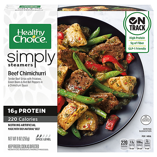 Enjoy satisfying and quick meals with Healthy Choice Simply Steamers Beef Chimichurri. Healthy Choice Simply Steamers offer deliciously healthy frozen meals that help you stay on track. This beef chimichurri combines 100% natural* beef strips, potatoes, crisp green beans and red bell peppers in a chimichurri sauce for frozen meals that are as flavorful as they are healthy. It is made with nothing artificial and is GLP-1 friendly with 16 grams of protein, 5 grams of fiber and 220 calories, delivering wholesome microwave meals that don't sacrifice flavor. Perfect for a quick lunch or dinner after a long day, keep this delicious ready-made meal in your freezer to always have healthy meals on hand.