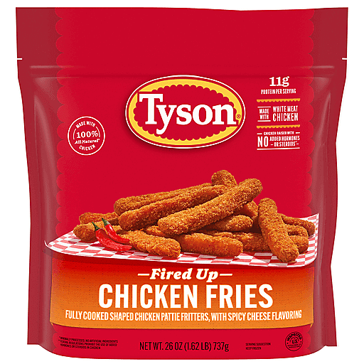 Turn up the heat on snack time or mealtime with our Tyson Fired Up Chicken Fries. Each 26 oz bag is packed with bold, spicy cheese flavor that will set your taste buds alight. Crafted from 100% all-natural* white meat chicken, our fully cooked chicken pattie fritters offer 11g of protein per serving. Whether you're in a rush or just looking for a quick and tasty option, our chicken fries are incredibly easy to prepare. Simply pop them into an air fryer, oven or microwave and they’re ready in minutes, crispy and hot! Ideal for dipping, Tyson Fired Up Chicken Fries make a fantastic pairing with your favorite sauces. Keep a bag in your freezer, and you’re always just minutes away from a delicious, dip-worthy treat that’s loved by all ages. Fire up your mealtime with Tyson Fired Up Chicken Fries – where flavor meets convenience! *Minimally processed. No artificial ingredients.**Federal regulations prohibit the use of added hormones or steroids in chicken.