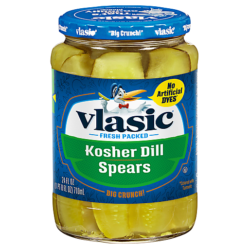 Vlasic Fresh Packed Kosher Dill Pickle Spears deliver a satisfying crunchy texture with classic dill flavor. Made with the Vlasic secret pickling recipe, these tasty dill spears are certified kosher and contain no artificial flavors or dyes (colored with turmeric). Vlasic pickles are perfect for sandwich toppings, grilling condiments and lunch snacks or for serving at picnics, barbecues, parties and more. These pickle spears are perfect low calorie snacks (pickles, a low calorie food) and keto friendly snacks (0 g of protein, 1 g net carbs [1 g total carbs minus 0 g dietary fiber], and 0 g added sugar per serving). They also fit a low carb lifestyle (1 g net carbs [1 g total carbs minus 0 g dietary fiber]). Vlasic Kosher Dill Pickle Spears are packed in a resealable pickle jar to lock in flavor and keep each dill pickle crunchy. With a wide variety of pickles, peppers and relishes in many cuts, flavors and sizes, Vlasic has offered big crunch since 1942.